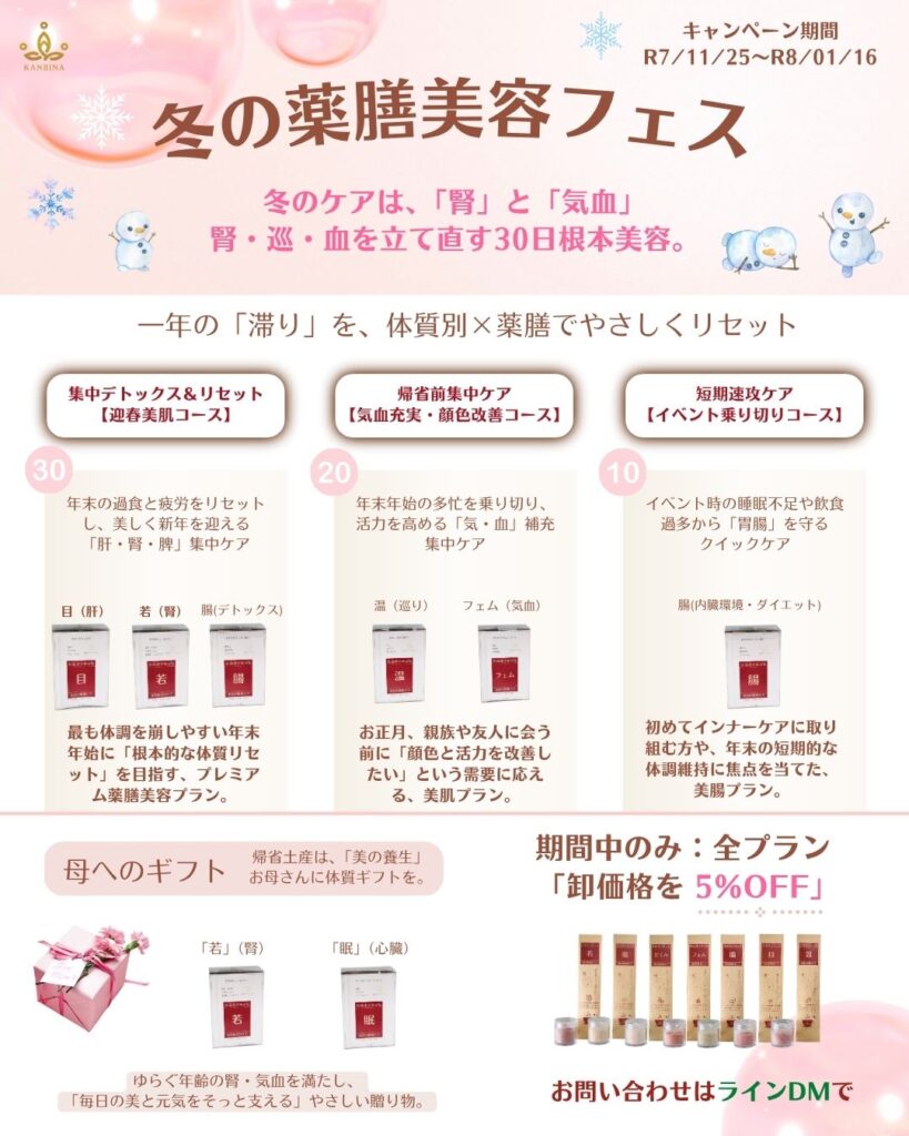 💡 年末の疲労回復 × 冬の腎ケア × 美肌養生 30日集中プログラムで、サロンのお客様に“体感できるご褒美”を。