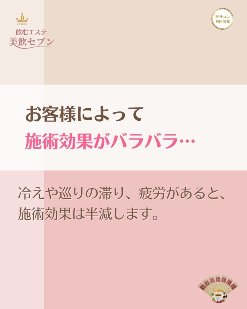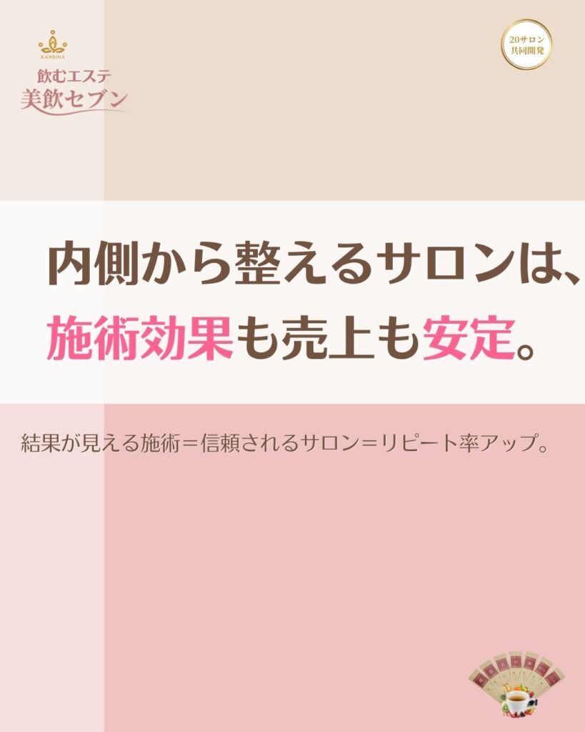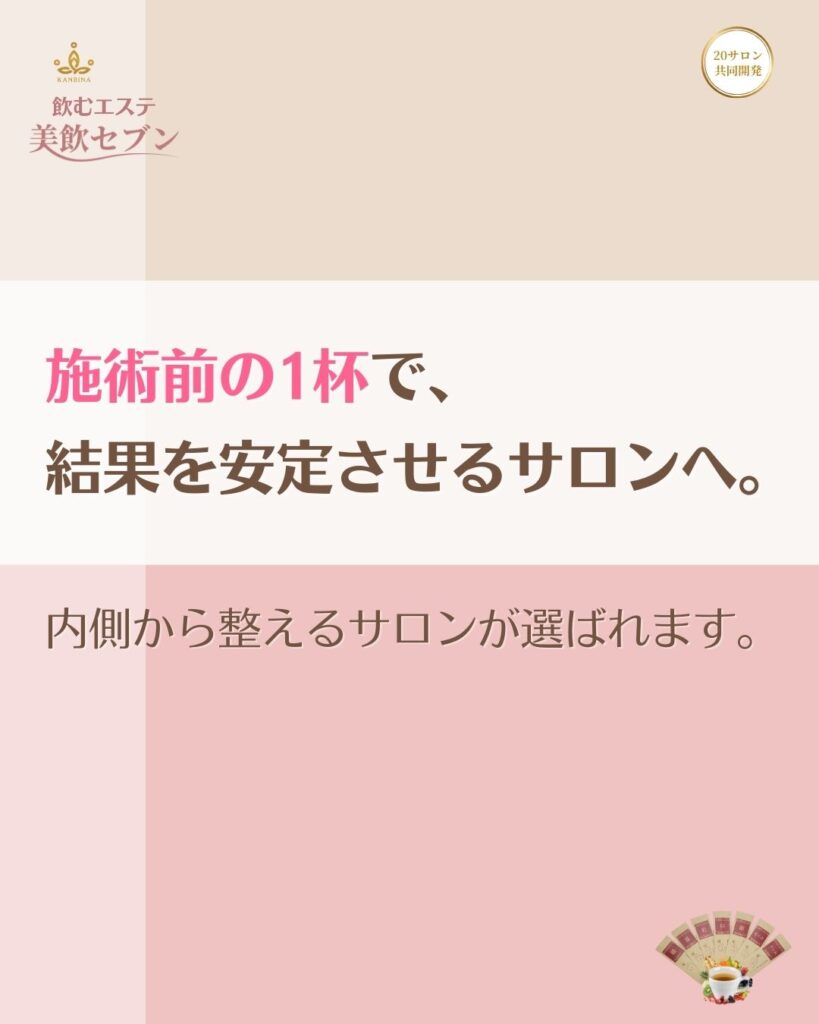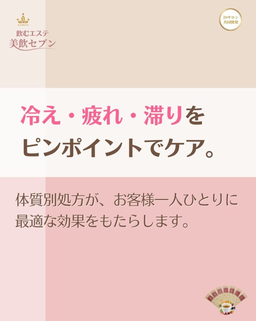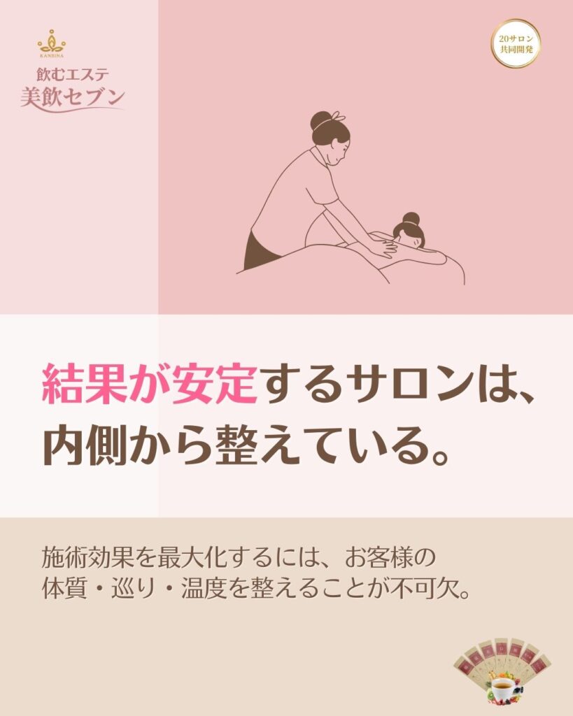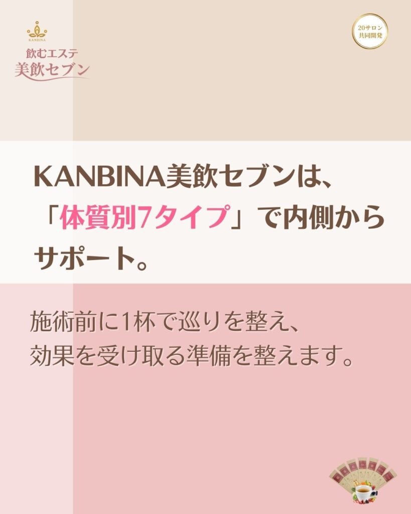 KANBINA美飲セブンは、1杯で体質別に巡り・温度・疲労を整え、施術効果を最大化。