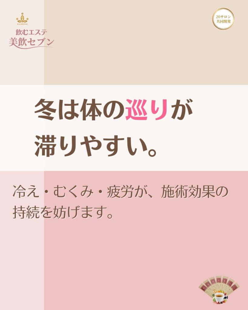 KANBINA美飲セブンは、体質別7タイプの処方で冷えや滞りを整え、施術効果を最大化。