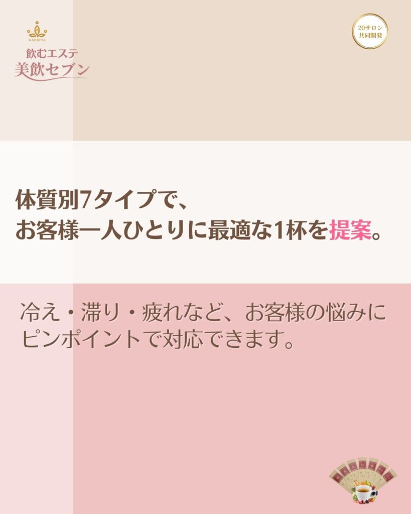 KANBINA美飲セブンは、体質別7タイプでお客様の悩みに最適な1杯を提案。