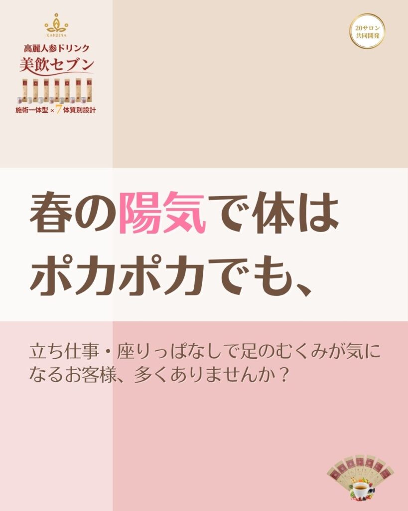 春は立ち仕事や座り仕事で、脚のむくみが気になる季節です。